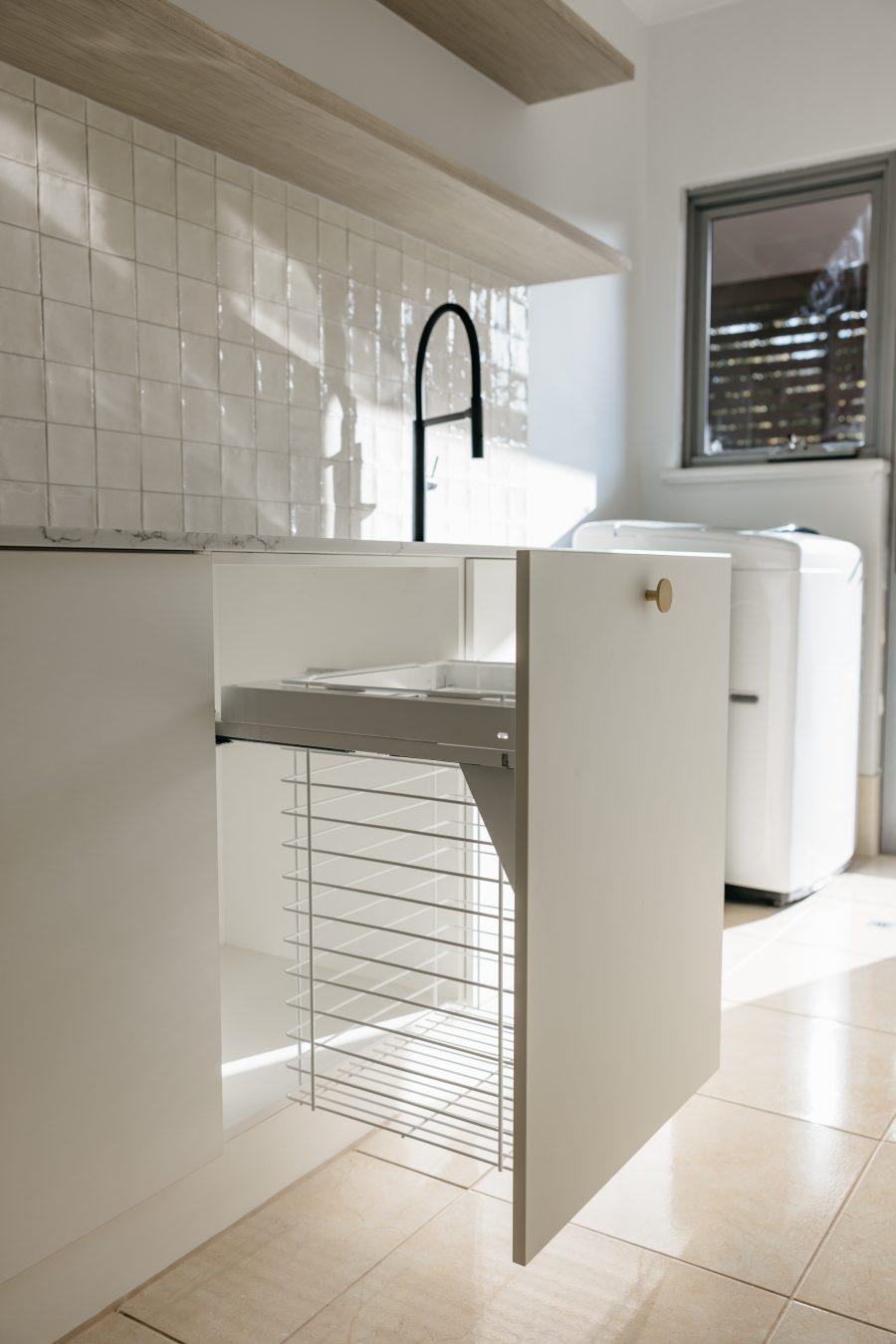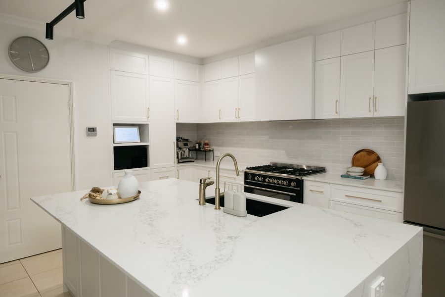 This Aveley home underwent a full kitchen and laundry renovation designed for both style and functionality. The kitchen features Laminex Settler Profile cabinetry in crisp white, paired with Zenith Surfaces Calacatta Signature benchtops with a single waterfall end for a seamless finish. Brushed gold tapware, an integrated Miele dishwasher, and feature curvature to the range hood adds a touch of refinement to the space. In the laundry and mudroom, the design flows effortlessly with matching stone and complimentary cabinetry, accented by warm timber shelving, VJ panelling, and elegant gold details. Together, these spaces create a bright, welcoming, and highly practical home environment that balances everyday usability with timeless sophistication.