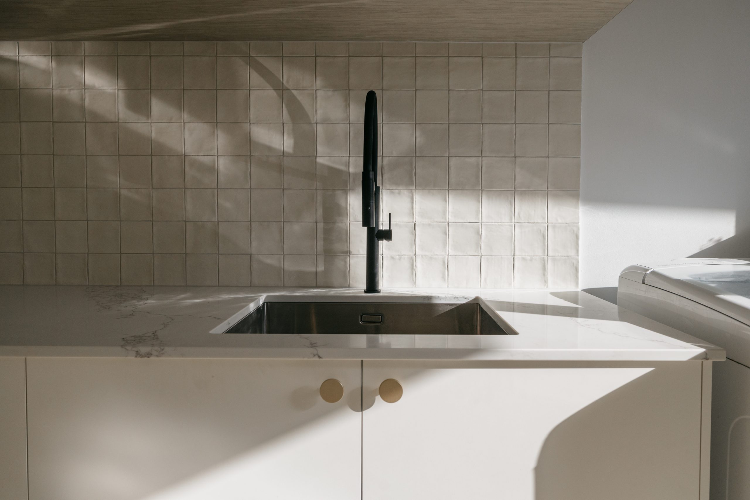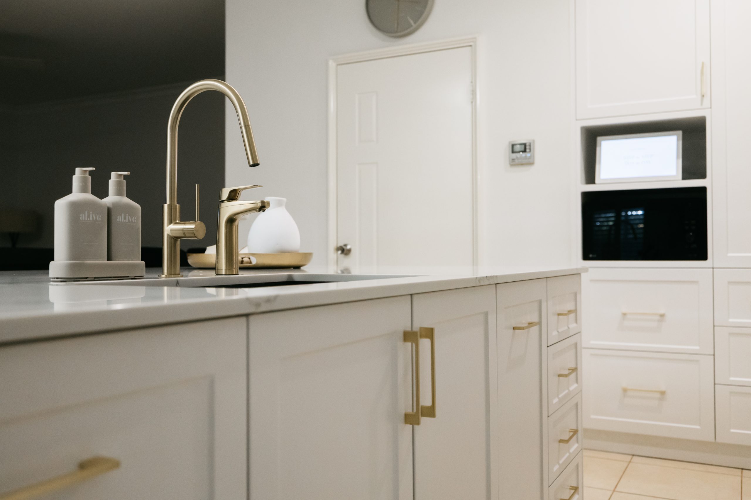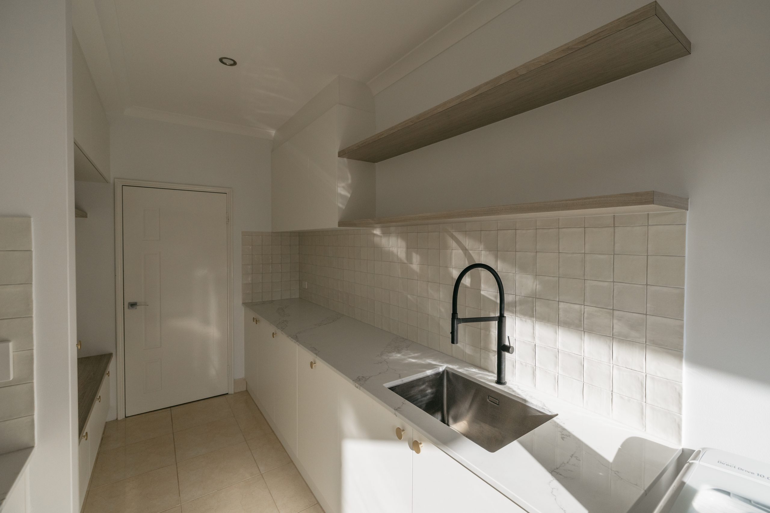This Aveley home underwent a full kitchen and laundry renovation designed for both style and functionality. The kitchen features Laminex Settler Profile cabinetry in crisp white, paired with Zenith Surfaces Calacatta Signature benchtops with a single waterfall end for a seamless finish. Brushed gold tapware, an integrated Miele dishwasher, and feature curvature to the range hood adds a touch of refinement to the space. In the laundry and mudroom, the design flows effortlessly with matching stone and complimentary cabinetry, accented by warm timber shelving, VJ panelling, and elegant gold details. Together, these spaces create a bright, welcoming, and highly practical home environment that balances everyday usability with timeless sophistication.
