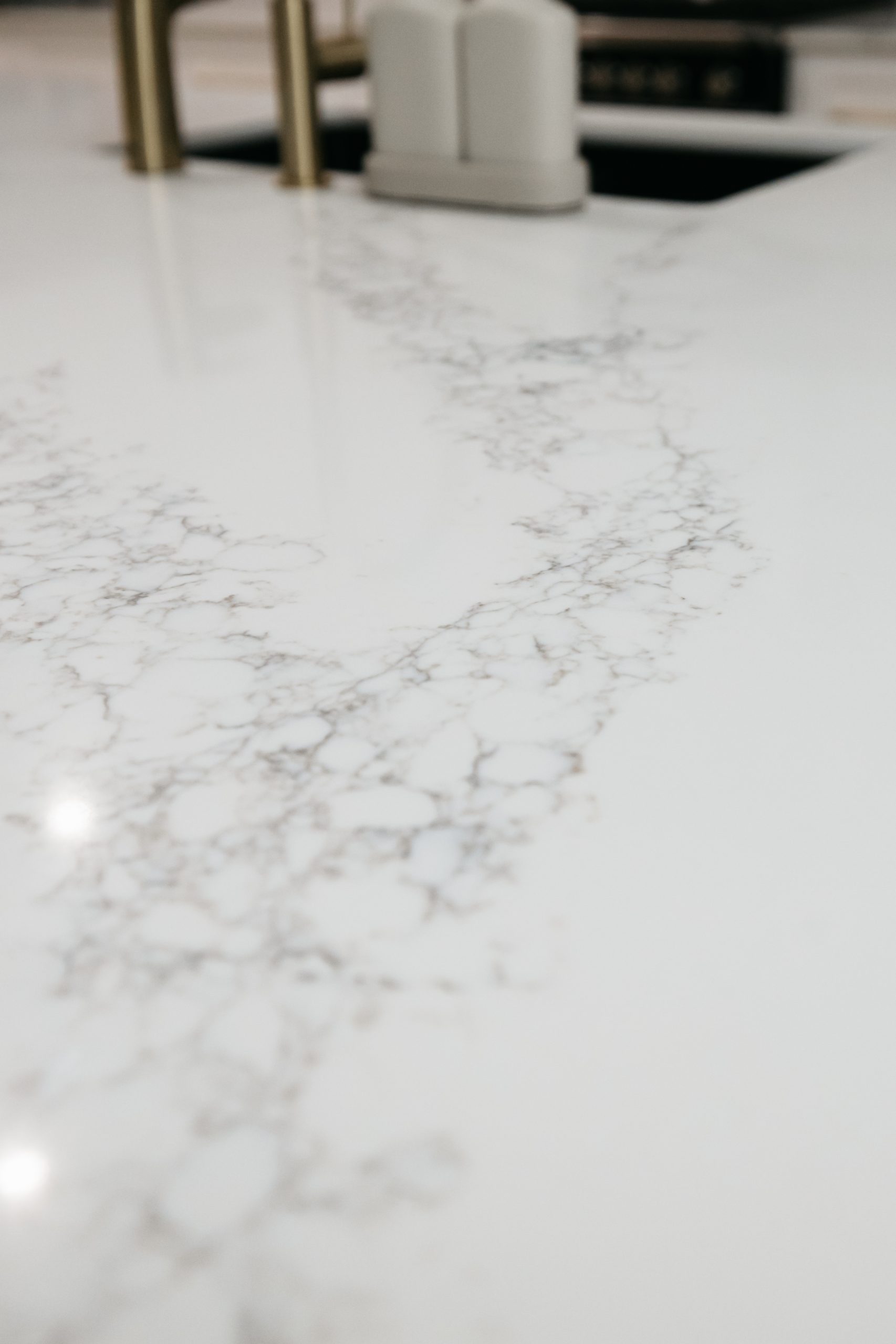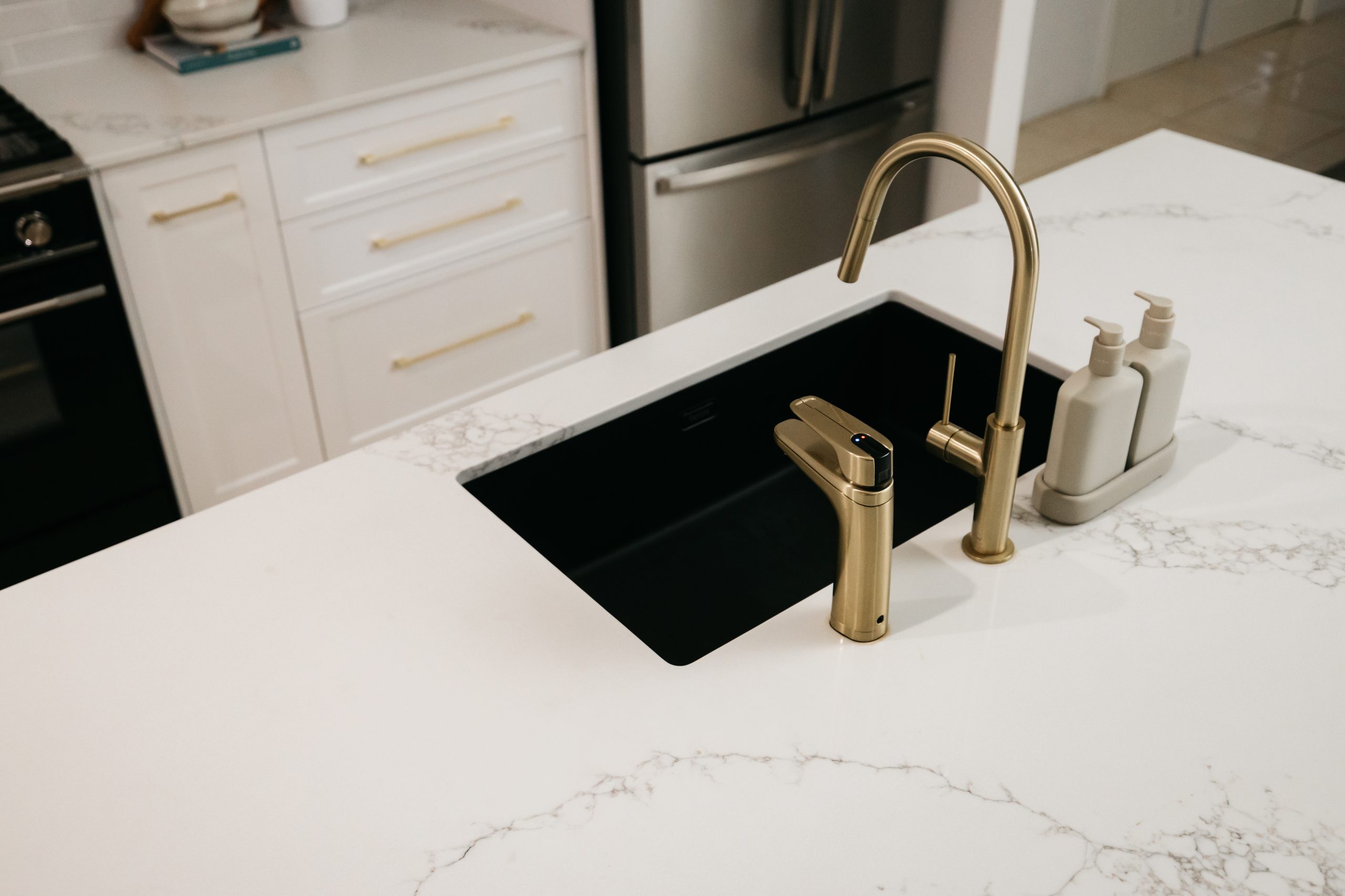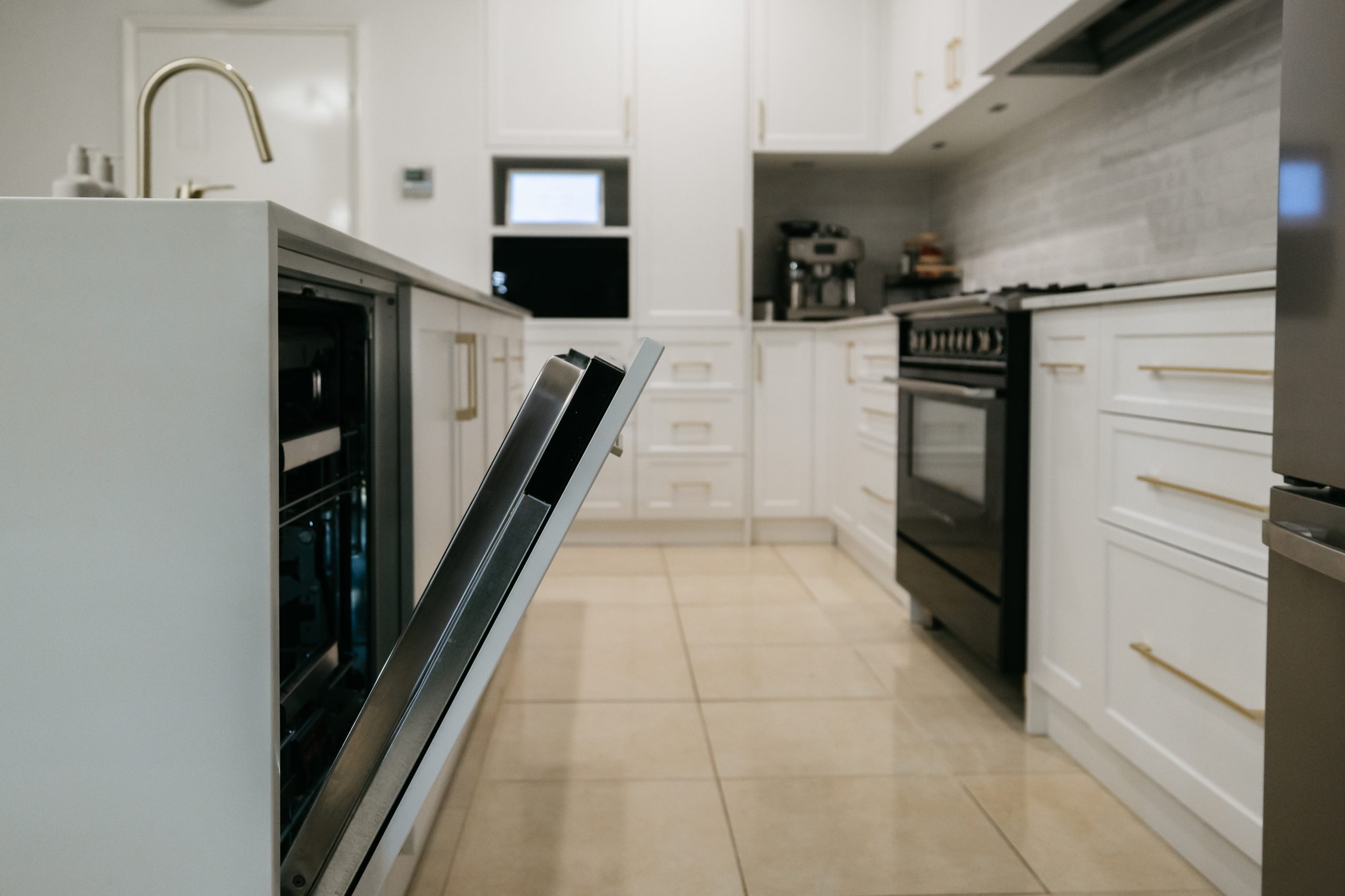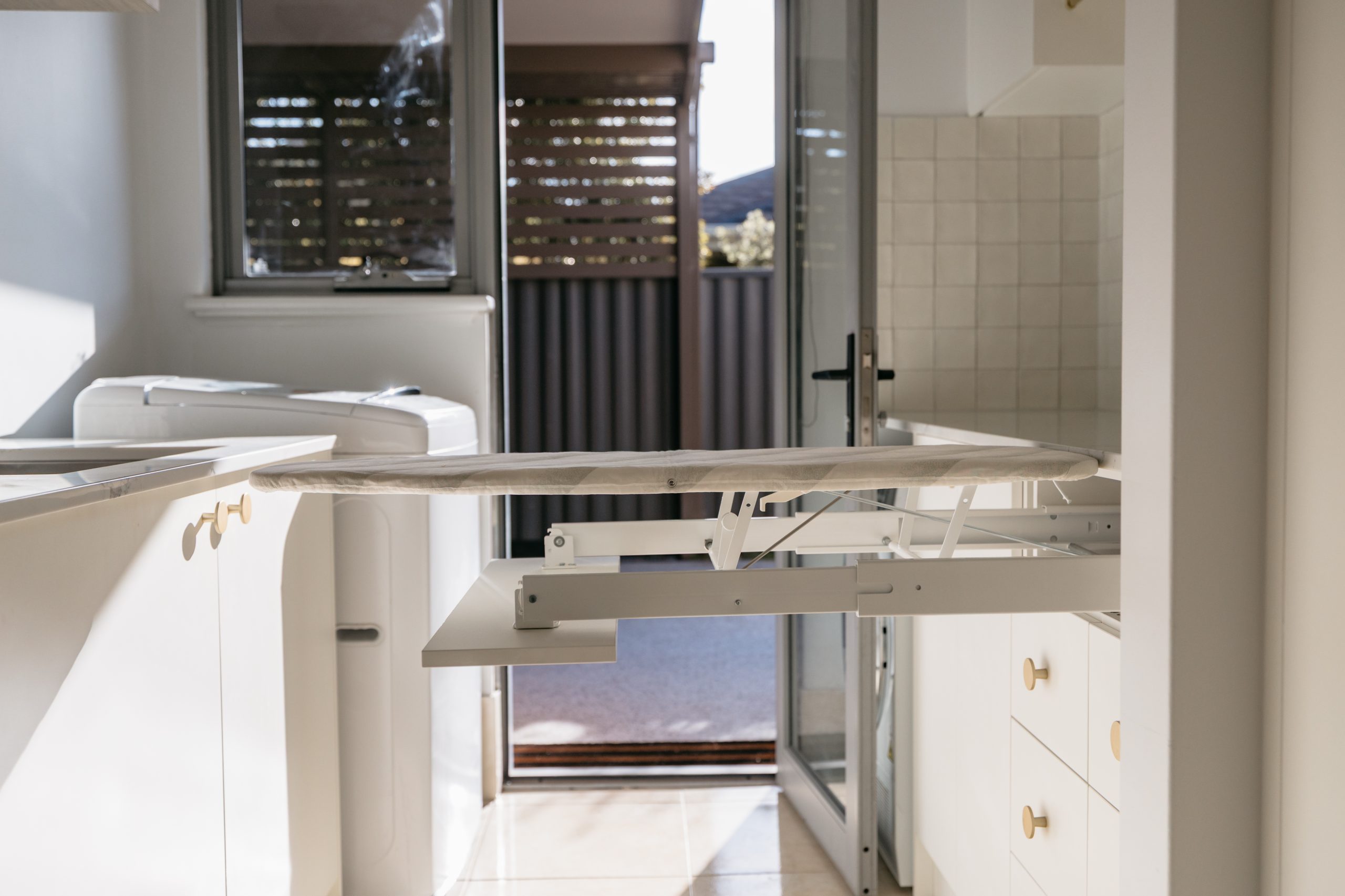 This Aveley home underwent a full kitchen and laundry renovation designed for both style and functionality. The kitchen features Laminex Settler Profile cabinetry in crisp white, paired with Zenith Surfaces Calacatta Signature benchtops with a single waterfall end for a seamless finish. Brushed gold tapware, an integrated Miele dishwasher, and feature curvature to the range hood adds a touch of refinement to the space. In the laundry and mudroom, the design flows effortlessly with matching stone and complimentary cabinetry, accented by warm timber shelving, VJ panelling, and elegant gold details. Together, these spaces create a bright, welcoming, and highly practical home environment that balances everyday usability with timeless sophistication.