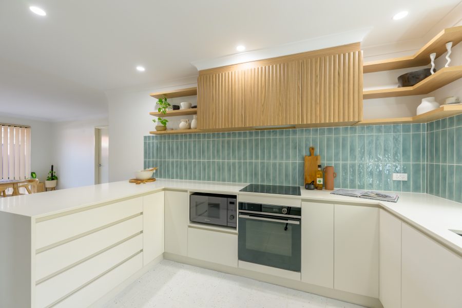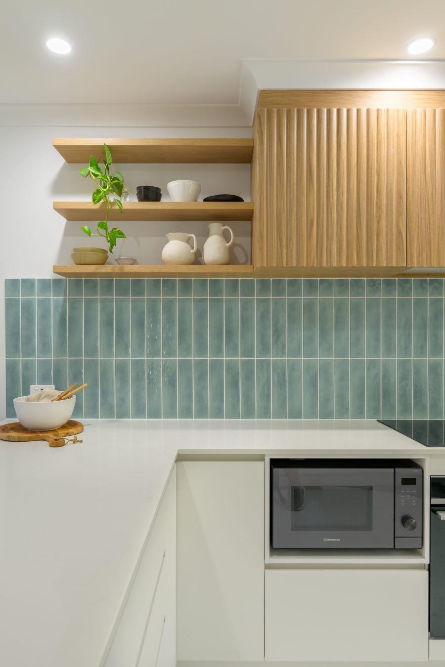 This modern coastal kitchen balances crisp finishes with a refreshing pop of colour. Featuring Polytec Blossom White cabinetry and Zenith Surfaces ‘Blanco Bliss’ benchtops, the design is both bright and timeless. Pocket doors conceal a dedicated tea and coffee station for a streamlined look, while a vertically stacked mint-green ripple subway splashback adds personality and charm.